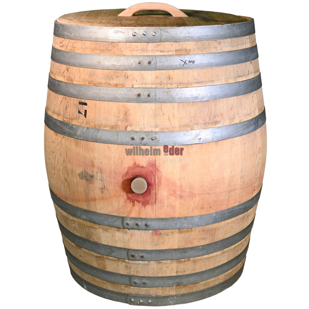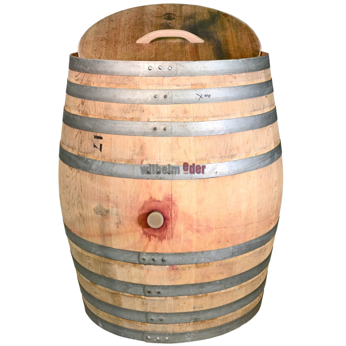 Tonneau d'eau de pluie fabriqué à partir d'un tonneau à vin usagé de 500 l en bois de frêne. Le couvercle est détaché et muni d'une poignée en bois. Différents modèles sont disponibles. Le tonneau peut présenter des colorations dues au vin rouge qui y a vieilli.