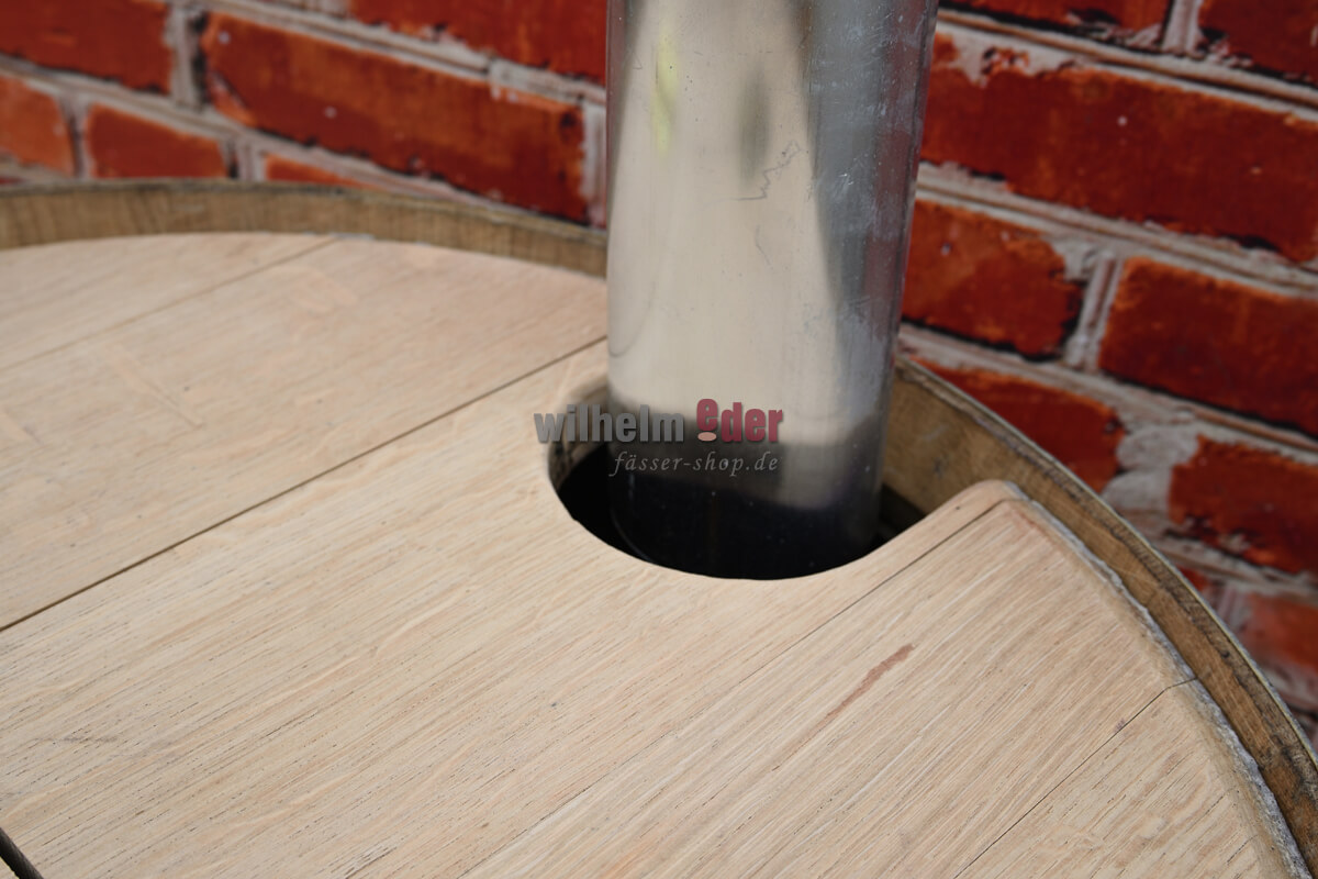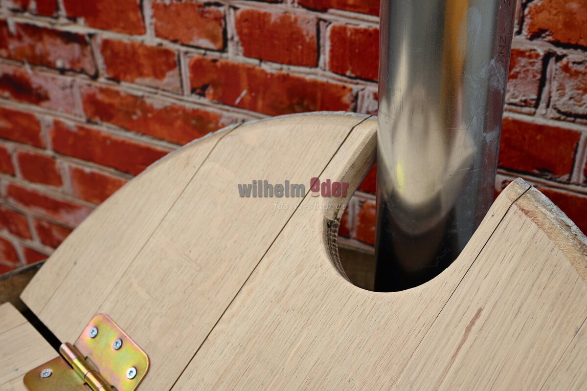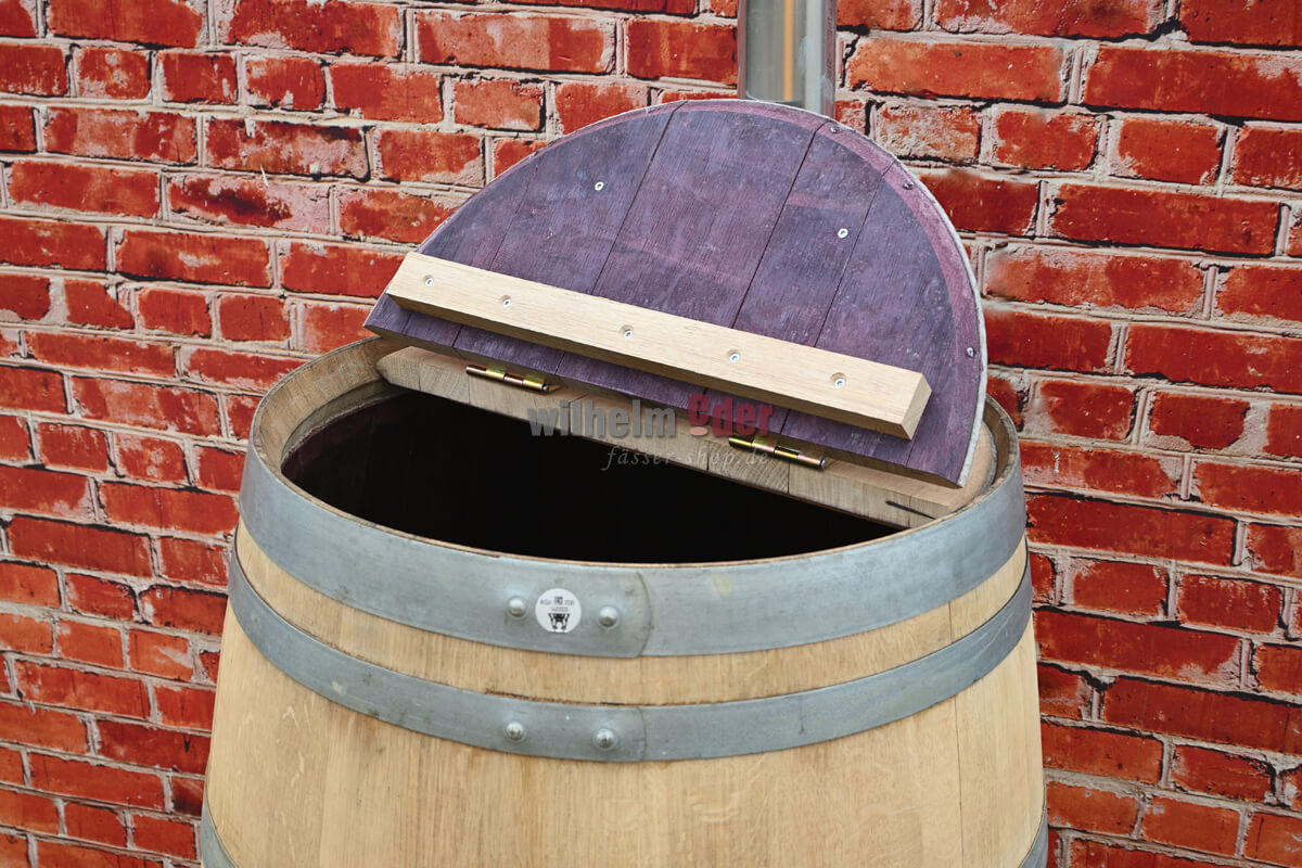 Le couvercle amovible, divisé en deux parties, peut être appliqué en montant deux charnières et une poignée en bois. La partie fixe est pourvue d'un évidement latéral par lequel vous pouvez introduire directement dans le tonneau un tuyau de descente d'eau de pluie d'un diamètre maximal de 100 mm.
