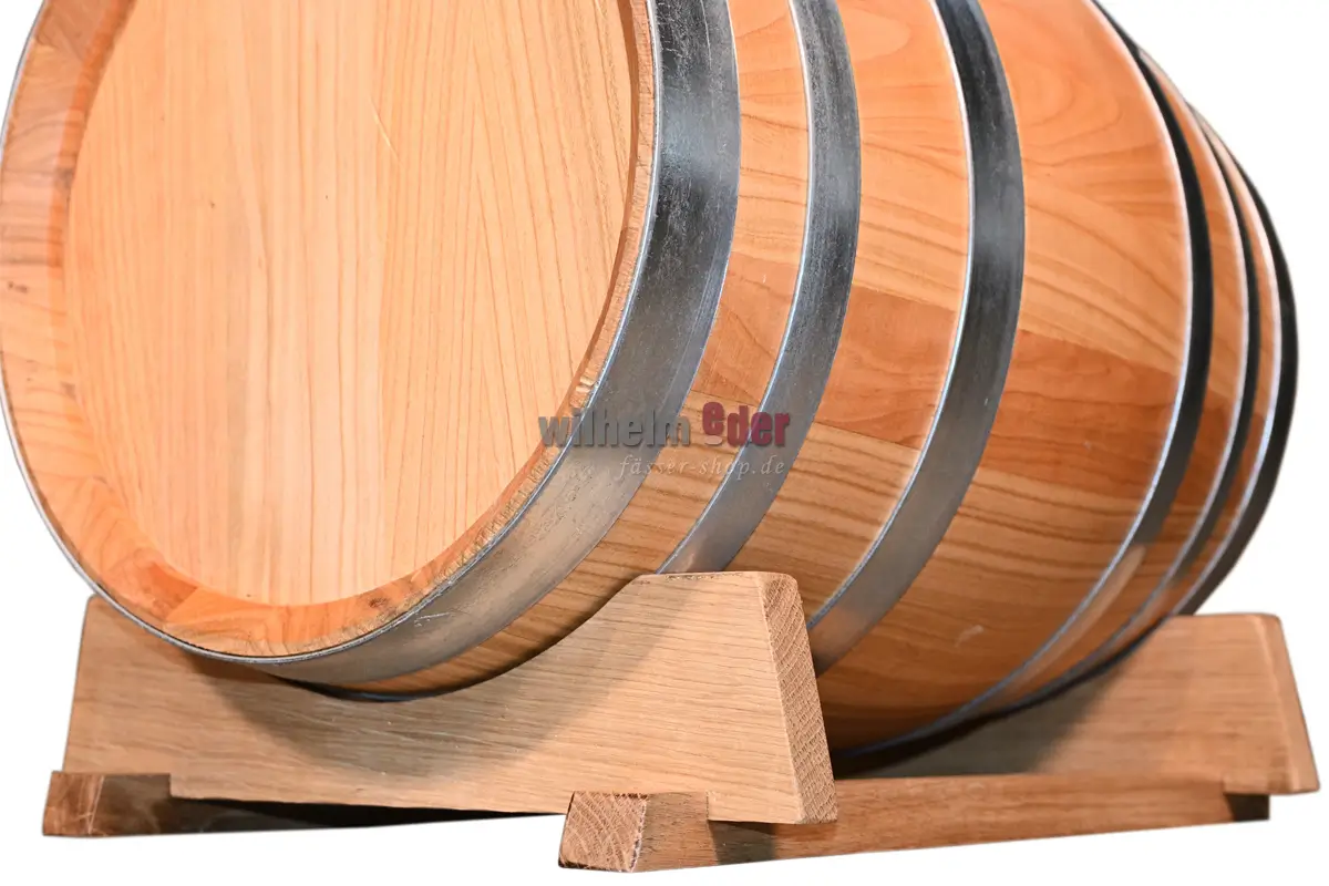 Tambour de stockage en bois de mélèze pour des fûts 20-50 l. Pour nos fûts de distillat jusqu'à une capacité de 20 litres, le support de fûts est inclus.