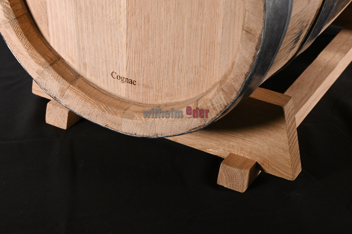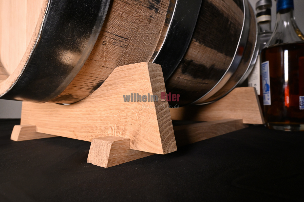 Tambour de stockage en bois de mélèze pour des fûts 20-50 l. Pour nos fûts de distillat jusqu'à une capacité de 20 litres, le support de fûts est inclus.