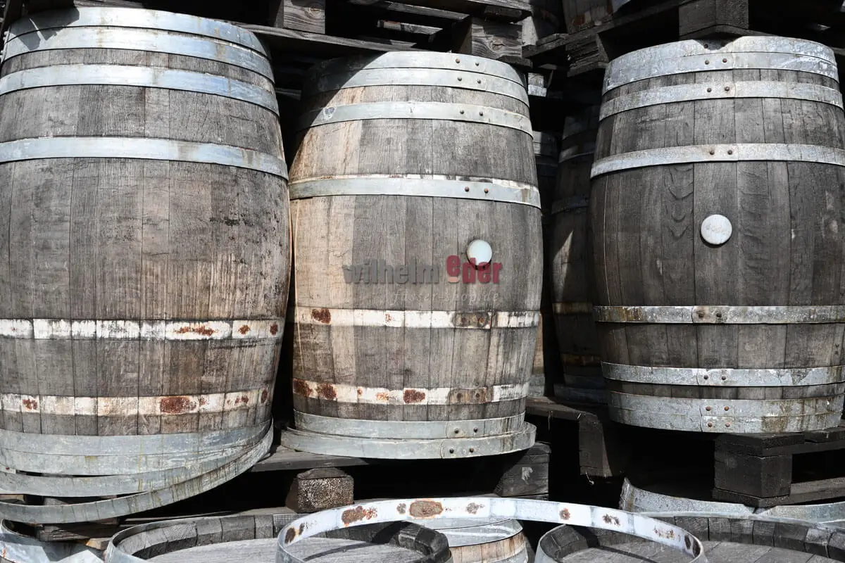 Les cercles des fûts (galvanisés ou noirs) présentent des traces de rouille, certains sont détachés ou manquants. Les fonds des tonneaux sont voûtés et les douelles des tonneaux présentent des fissures ou des fractures dues à la tension - l'étanchéité ne peut donc pas être garantie.
