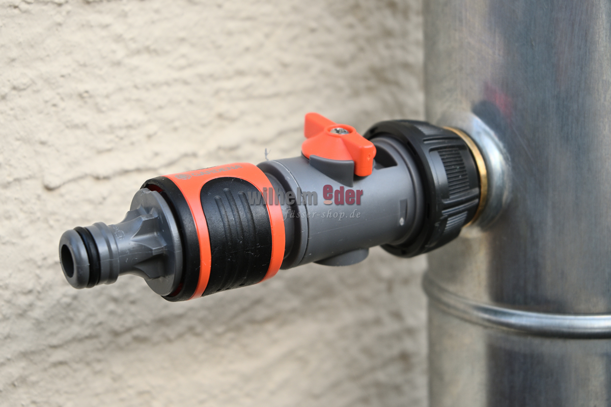 Le tuyau fourni n'est pas conçu pour être raccordé à l'avant du raccord Gardena. Il s'agit plutôt d'une possibilité de rallonge qui peut être raccordée directement au coupe-pluie en cas de besoin. Un tuyau d'arrosage adapté est raccordé au raccord Gardena avec arrêt de régulation afin d'arrêter l'arrivée d'eau en cas de besoin, par exemple lorsque le tonneau d'eau de pluie déborderait sinon.