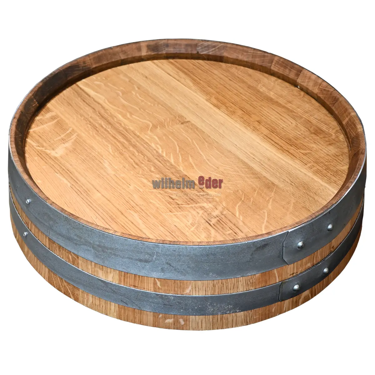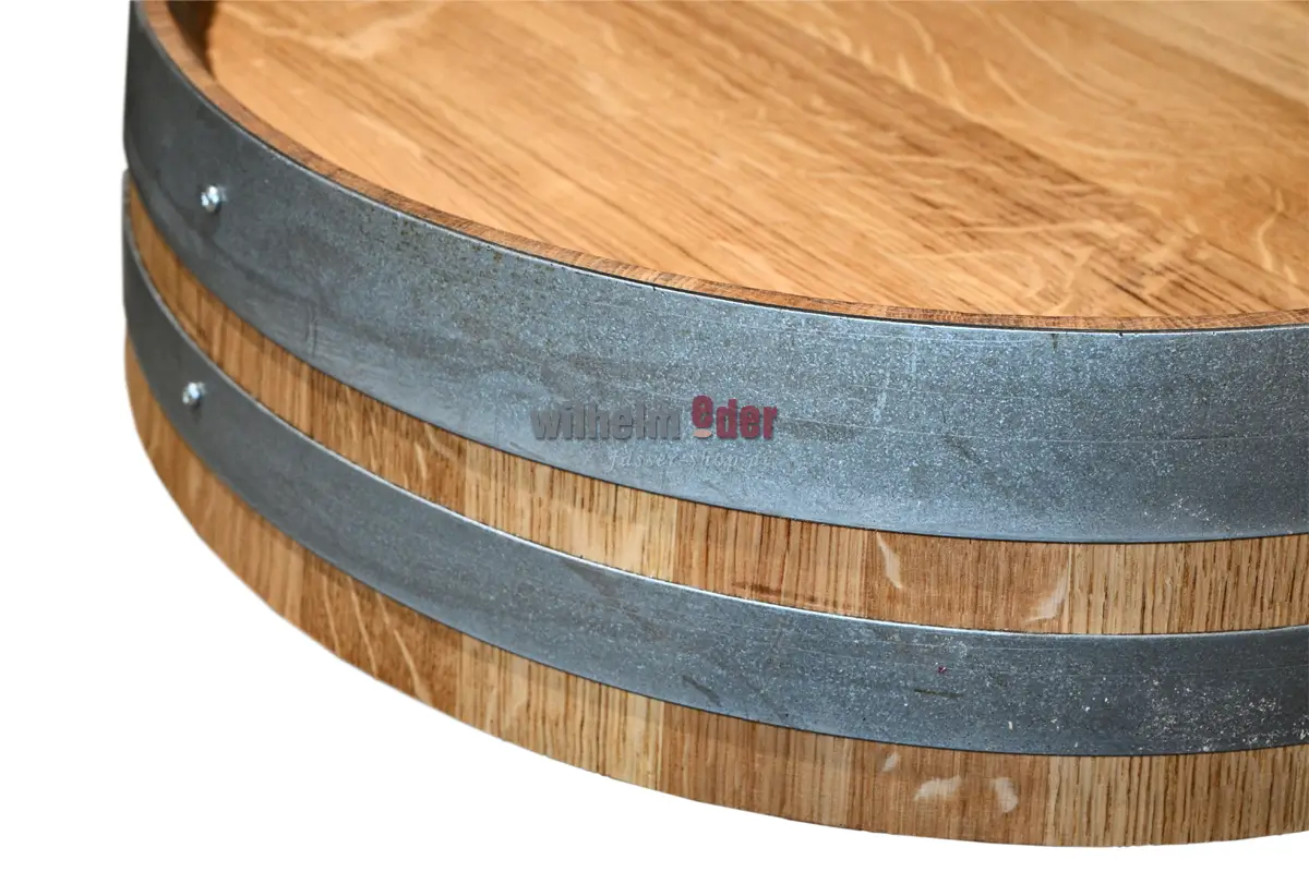 Notre menuiserie fabrique des parties supérieures décoratives d’anciens fûts. La partie supérieur des fûts de vin est coupé à environ 9-15 cm (selon le placement des cercles). Les partie supérieures des fût „nature“ ne sont pas traitées et peuvent avoir des traverses. Les cercles ne sont pas peints.