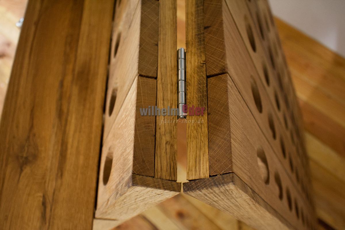 Nos pupitres de remuage pour 120 bouteilles proviennent directement du fabricant français Leban. Les pupitres sont reliés par des charnières solides et sont empêchés de se déployer par des chaînes au milieu. Pour le pupitre, nos charpentiers fabriquent quatre étagères stables qui peuvent être placées sur un ou deux côtés du pupitre. Le système enfichable vous permet d'ajuster la hauteur des étagères à vos besoins.