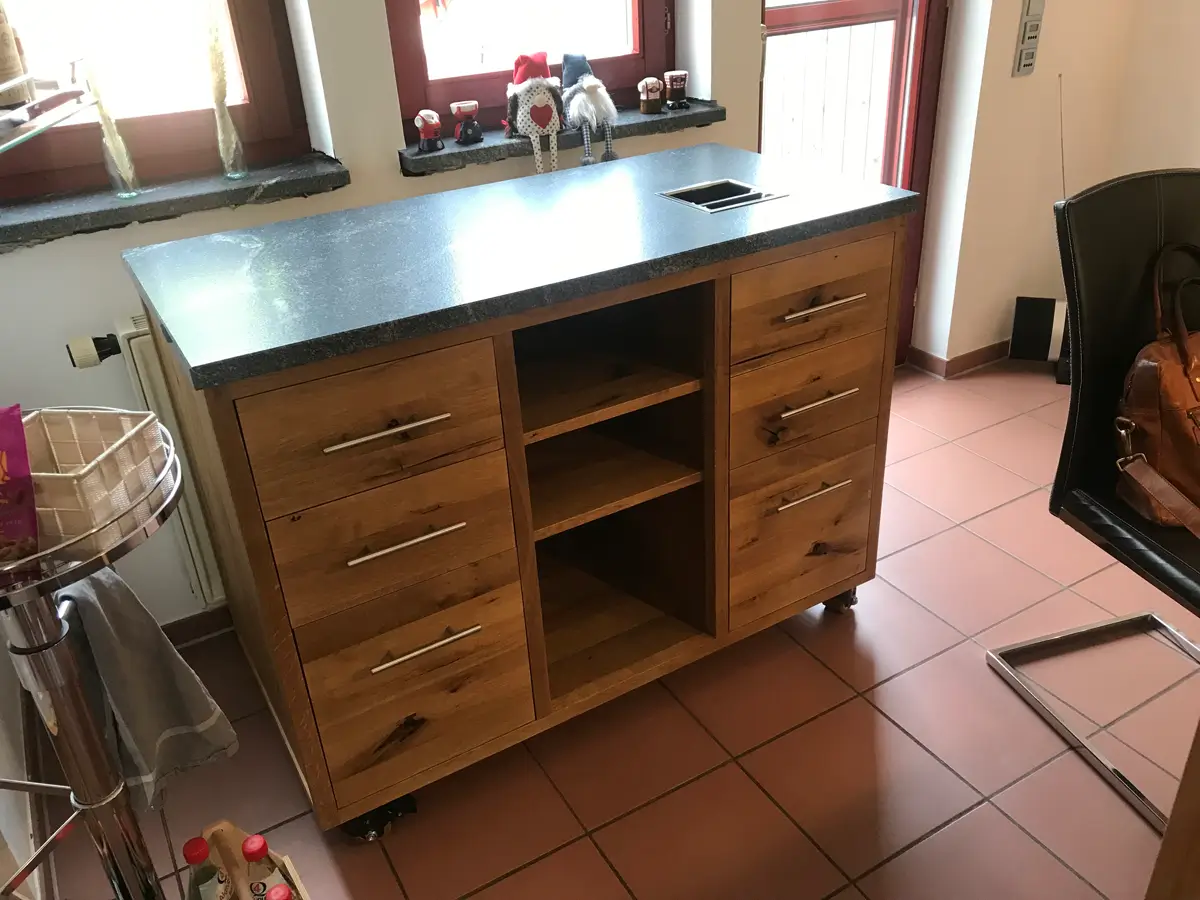 Für einen anspruchsvollen Kaffeeliebhaber entstand ein individueller Schrank aus massivem, astigem Eichenholz im Vintage-Look. Die honigfarbene Beize betont die natürliche Maserung und verleiht dem Möbel seinen charaktervollen Ausdruck. Ausgestattet mit einer 30 mm starken Steinplatte, durchdachter Schubladenaufteilung und Schwerlastrollen verbindet das Unikat hochwertiges Handwerk mit Funktionalität – perfekt abgestimmt auf den Barista-Alltag.