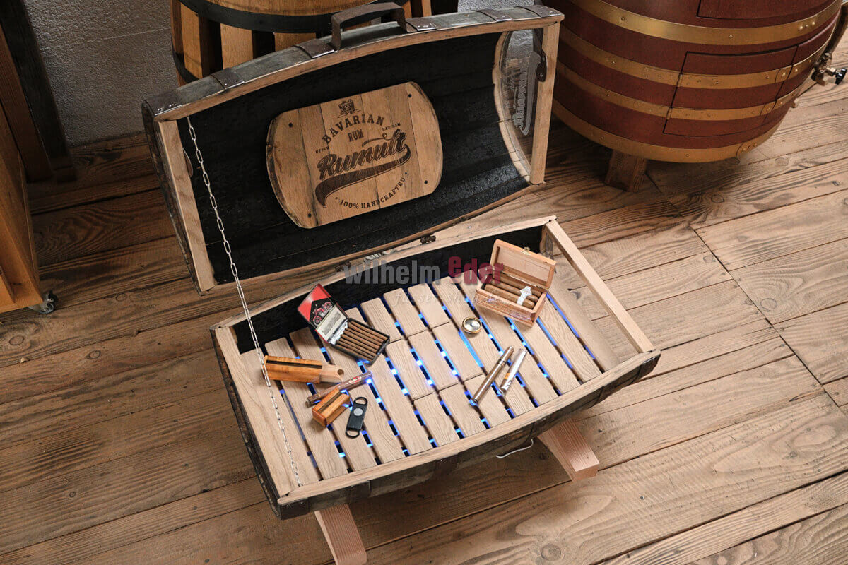 Für einen langjährigen Kunden durften wir ein gebrauchtes 125 l Fass in einen Humidor verwandeln. Das Fass wurde professionell getrocknet und verleimt, die Fassköpfe wurden durch Plexiglasscheiben ersetzt, das Fass bekam ein herausnehmbares Inlay aus Eichenholz mit dem die Luftzirkulation gewährleistet ist.