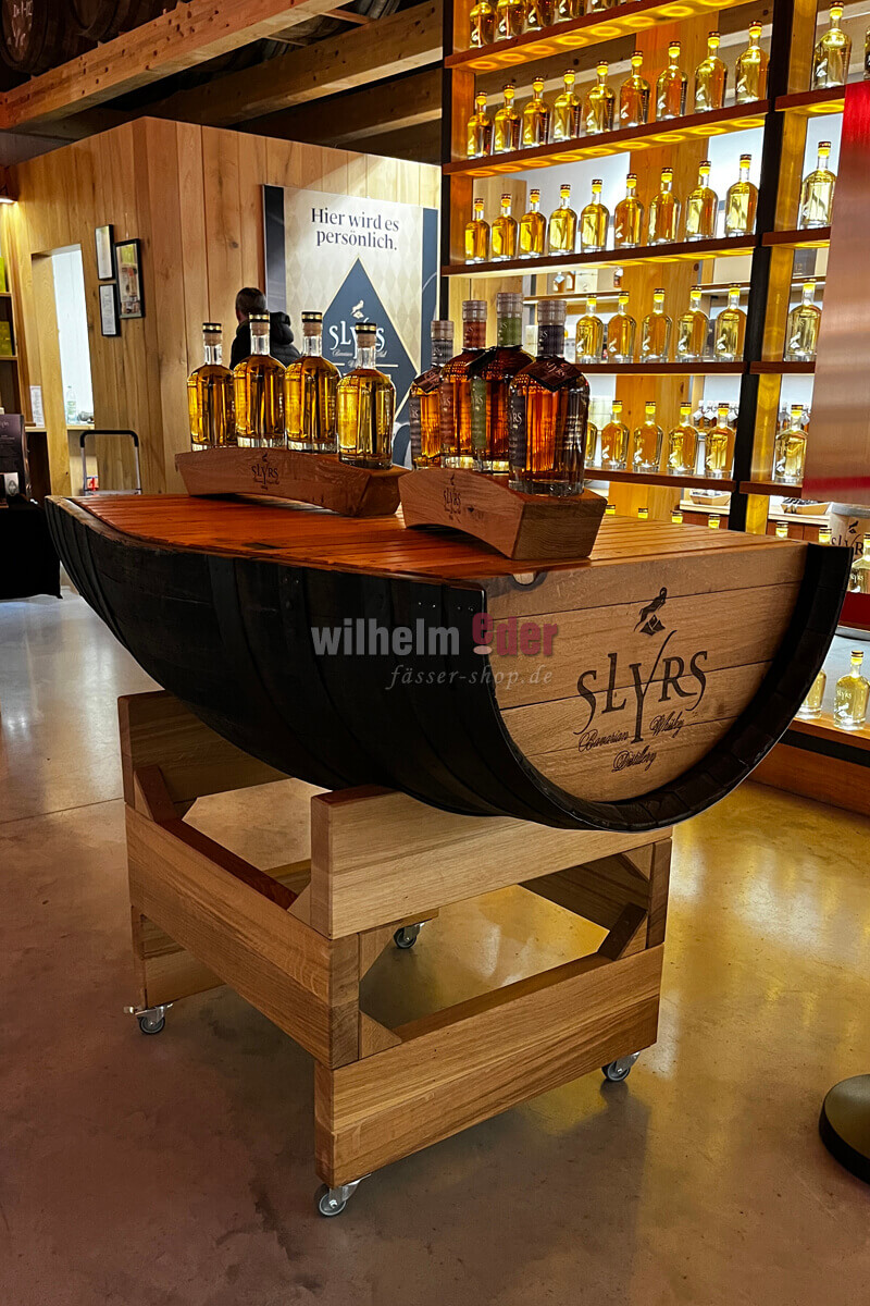 Präsentationstisch hergestellt aus einem längshalbierten ehemaligem Sherryfass auf einem massiven Eichenholzbock der auf vier Schwerlastrollen lagert. Die längsgeteilte Fasshälfte wurde verleimt und mit einem Einlegeboden aus Eichenholz aus gebrauchten Fässern bündig mit der Schnittkante ausgestattet. Seitlich haben wir eine Schublade zum Aufziehen als Ablagefach in den Tisch integriert. Zur Personalisierung haben wir das Fass noch mit 2 Laserbrandings des Kunden ausgestattet.