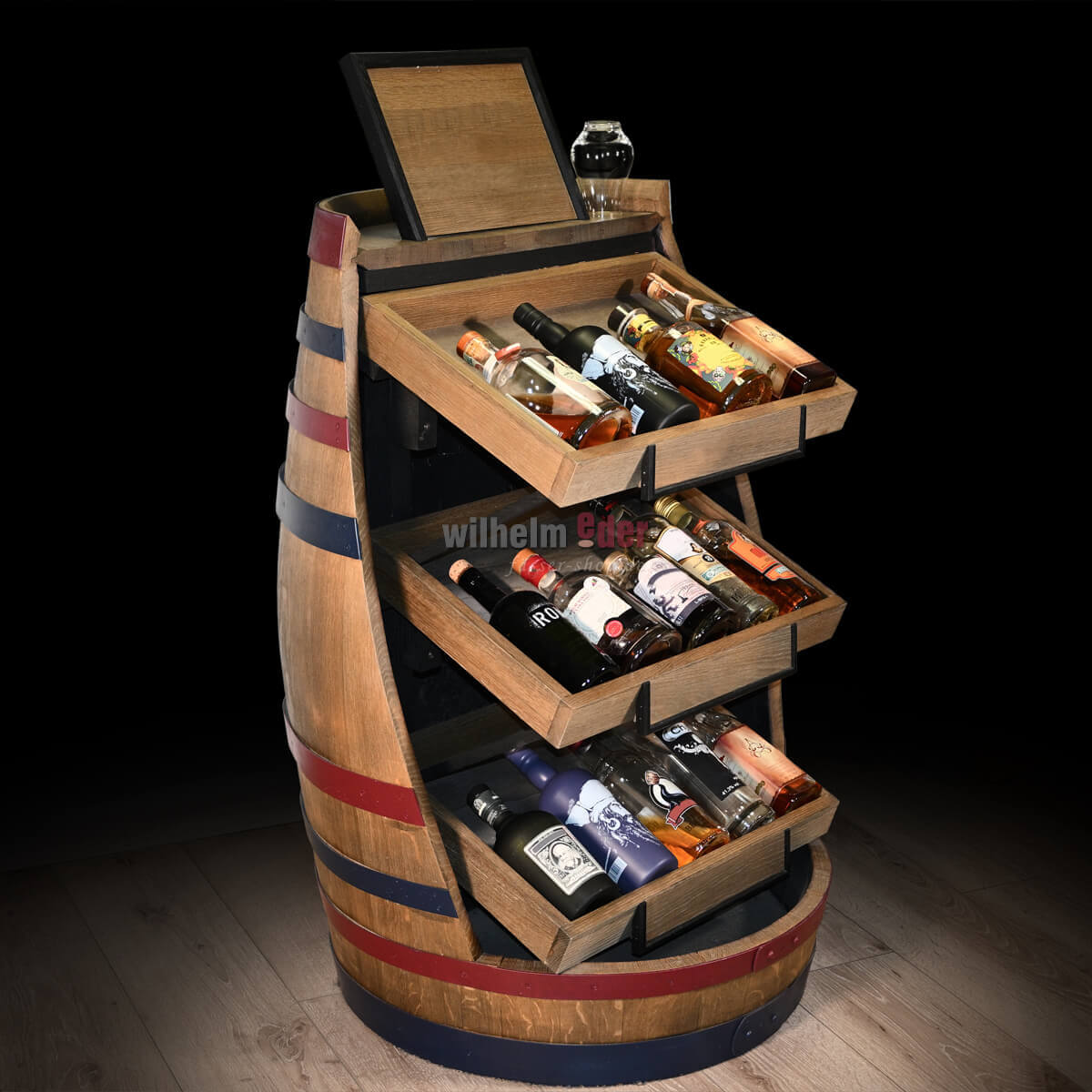 Ein ca. 200 l großes Fass wird diagonal von oben nach unten aufgetrennt. Anschließend wird das Fass in sich stabilisiert und die Reifen befestigt. Für eine bessere Haptik werden dann die Kanten gerundet und die Metallreifen entgratet. Zum Präsentieren der Flaschen wird ein halber Fassboden wird mittig eingezogen und der Hintergrund geschwärzt. Ein optisches Highlight bieten zusätzlich die gebürsteten Reifen. Eine besondere Außenbehandlung des Fassholzes mit weißem Lack (Optik weiß gekalkt, „shabby“) vervollständigt die exklusive Optik des Displays. Für das „Gewisse Etwas“ wird ein Logo rückseits auf den Bauch gedruckt und ein Schild oben am Fass (Optik weiß gekalkt, “shabby”) montiert. Das komplette Display wird abschließend mit einem matten Klarlack überzogen.