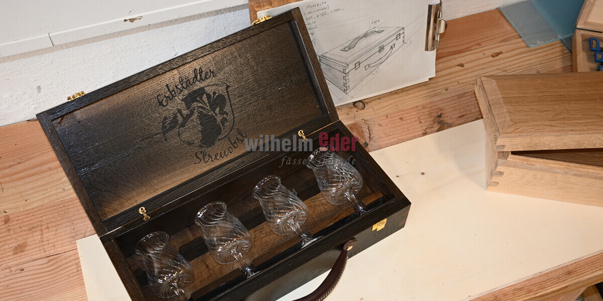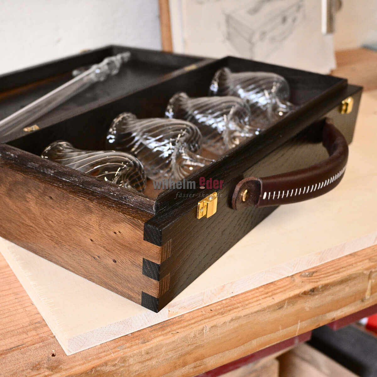 Für einen Kunden fertigten wir aus seltener Moor-Eiche eine kleine Transportkiste für sein Tastingzubehör. Gläser und Probenheber werden so sicher von A nach B transportiert und stilvoll aufbewahrt.