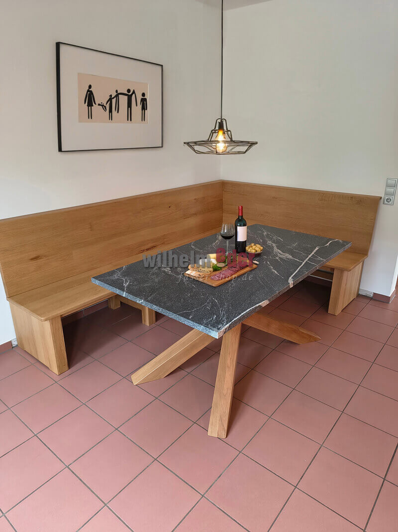 Für einen Kunden wurde in unserer Schreinerei eine maßgefertigte Eckbankgruppe aus Eichenholz gebaut. Der Wunsch des Kunden war, dass die bereits vorhandene Granit-Tischplatte als Highlight der Esszimmerecke in Szene gesetzt wird.
