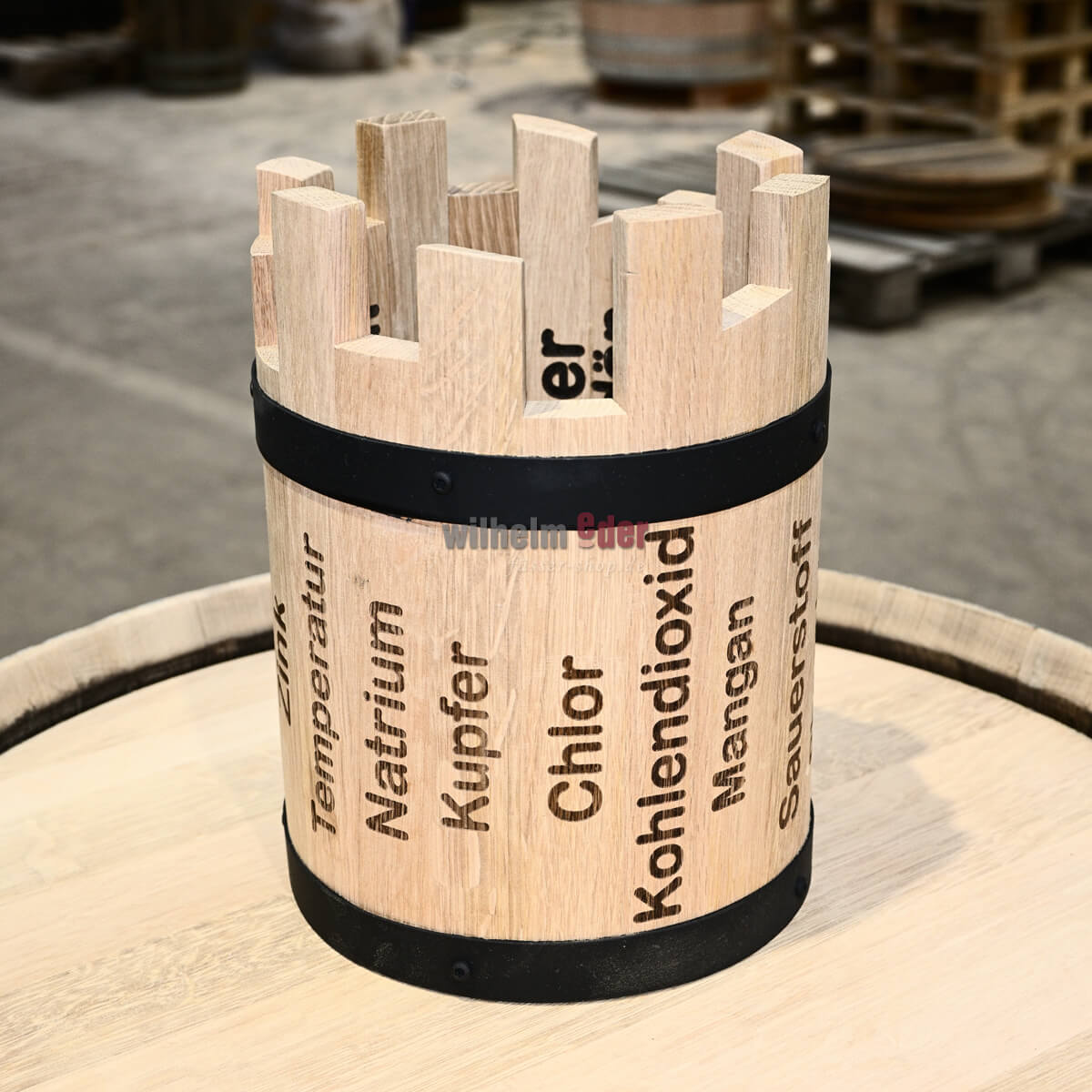 Das Fass ist aus neuen Dauben produziert. Die Dauben sind zusätzlich verleimt, verschliffen und in die verschiedenen Höhen gekürzt sowie mit insgesamt 38 Laserbrandings (innen und außen) versehen.