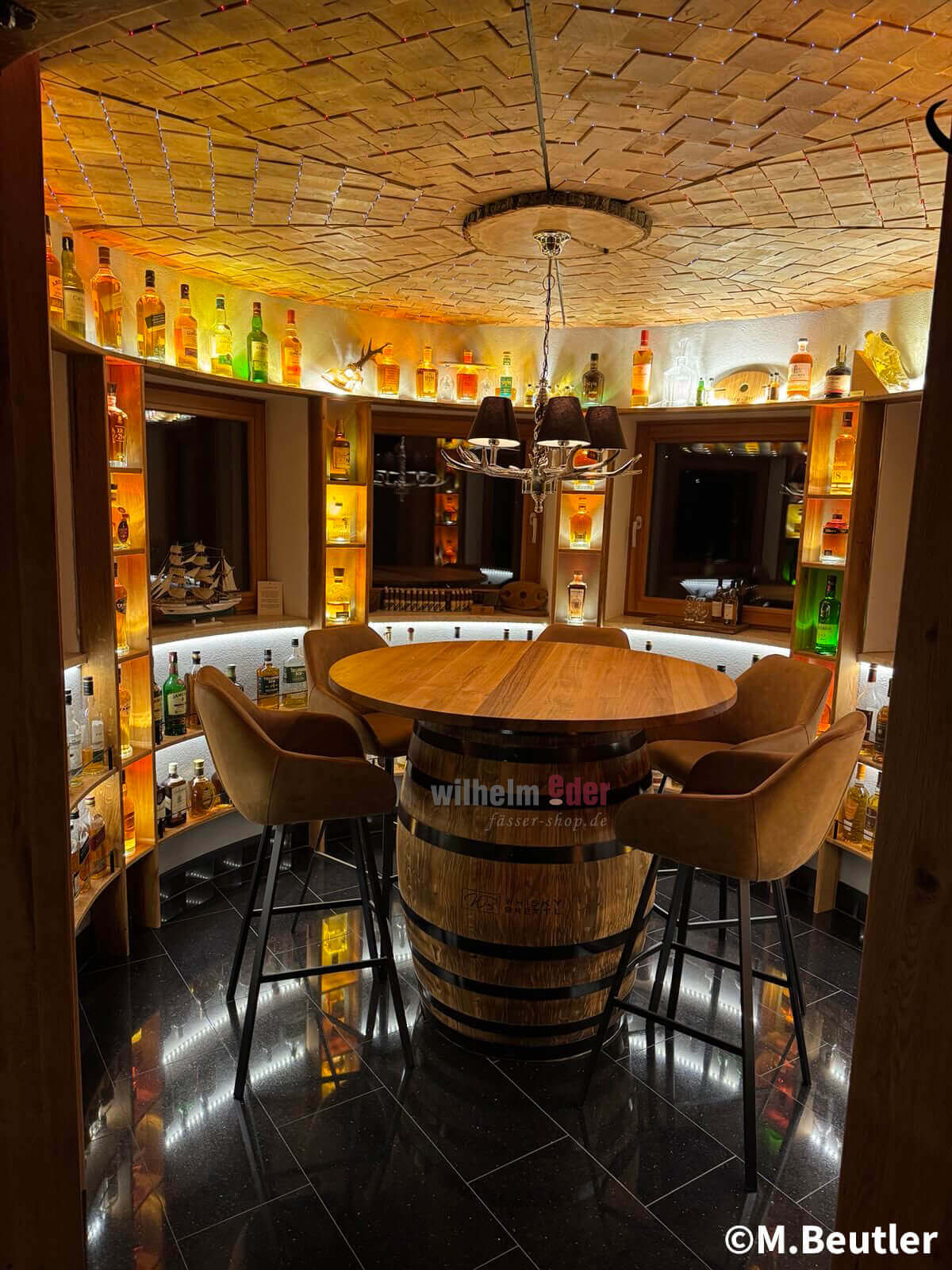 Ein echtes Highlight für jede stilvolle Bar oder Whisky-Lounge: Dieser maßgefertigte Stehtisch wurde aus einem alten 400 l Eichenfass gefertigt. Die Dauben des Fasses wurden verleimt, um maximale Stabilität und Langlebigkeit zu gewährleisten. Gekrönt wird der Tisch von einer massiven, 120 cm großen Eichenholzplatte, die perfekt zur rustikalen Ästhetik des Fasses passt.