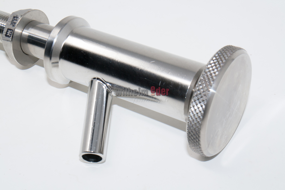 Soupape de prélèvement d’échantillon pour des fûts de grande taille. Déjà installée avec un contre-écrou à l’intérieure et un grand disque U à l’extérieure.