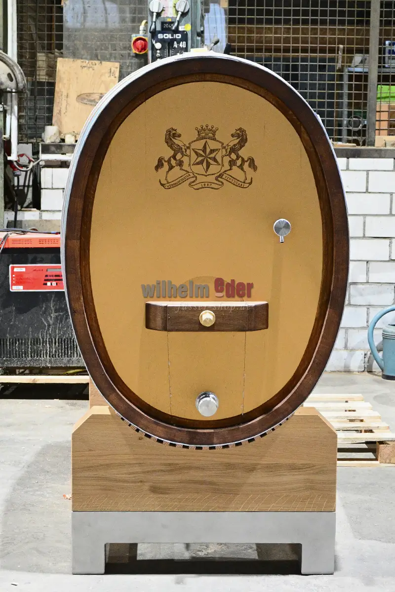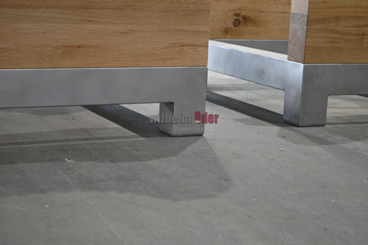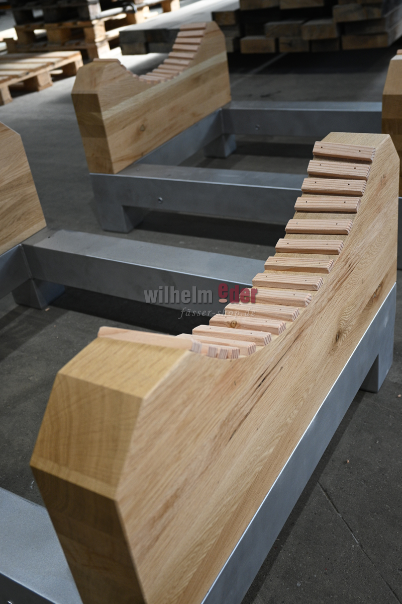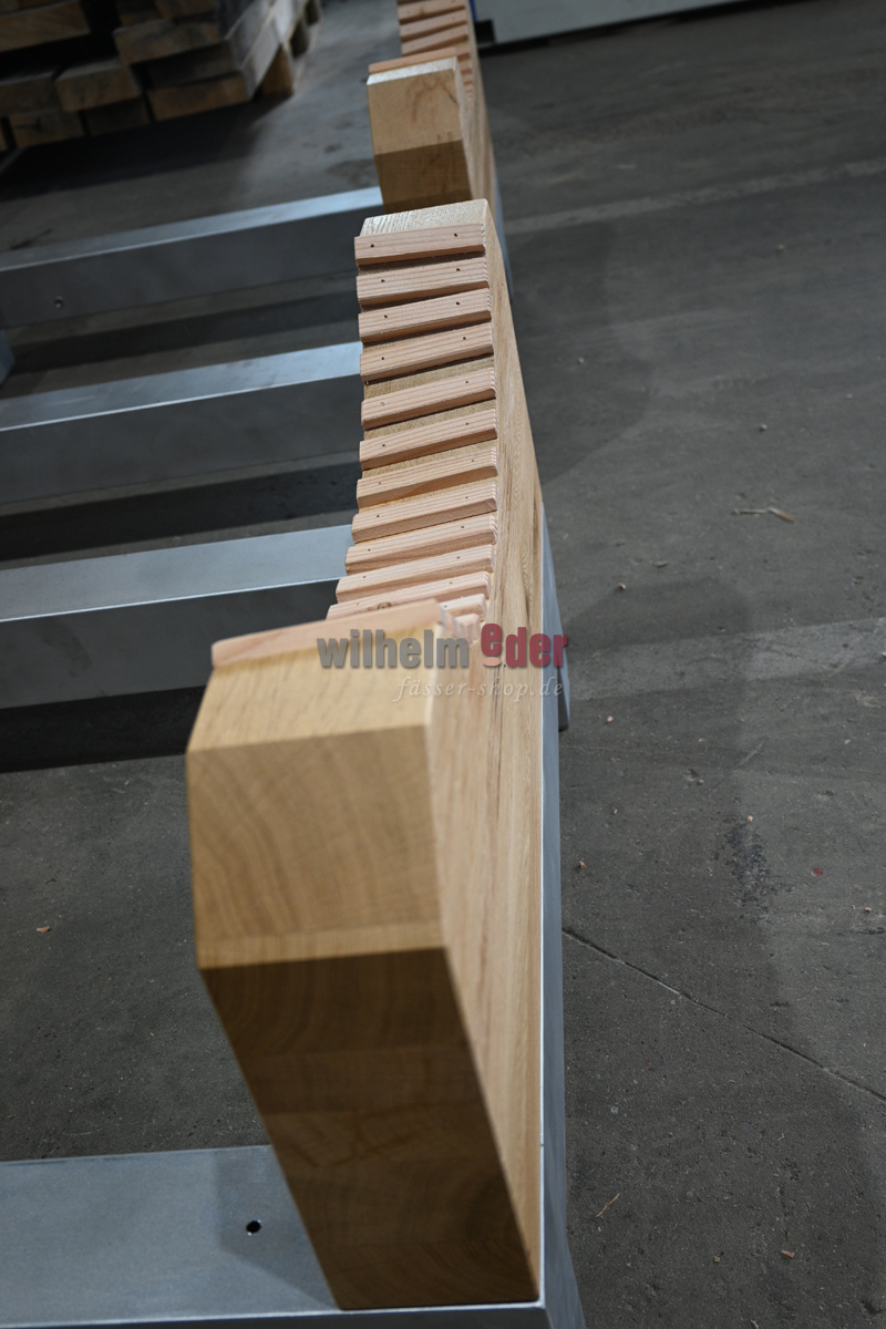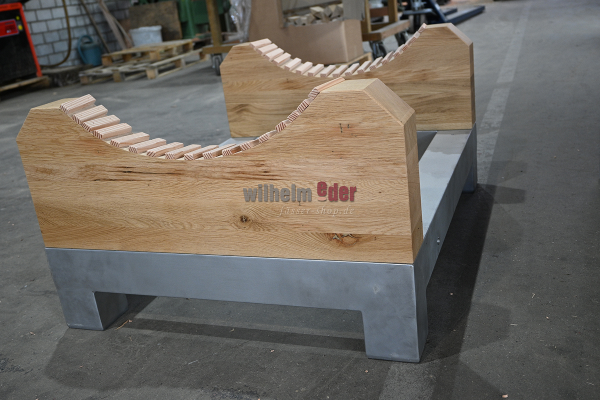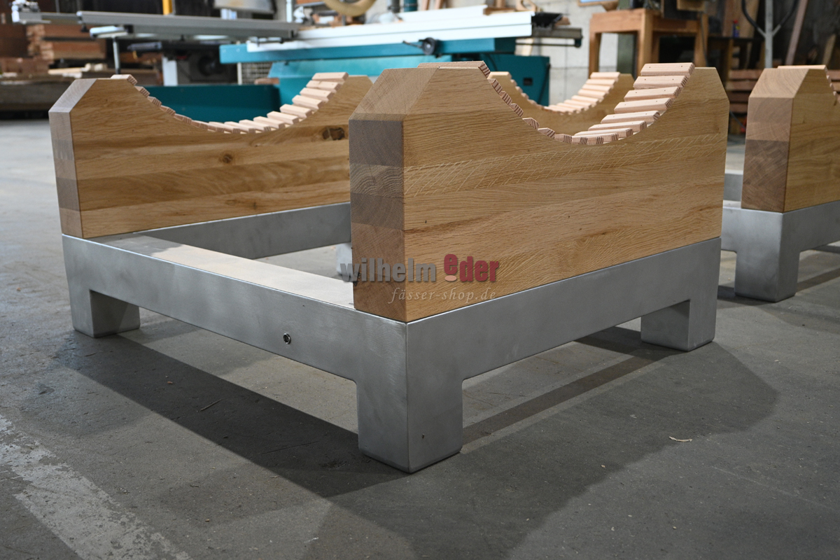 Informations sur le produit "Support pour fûts en acier inoxydable / bois de chêne pour fûts ovales jusqu'à 25 hl "