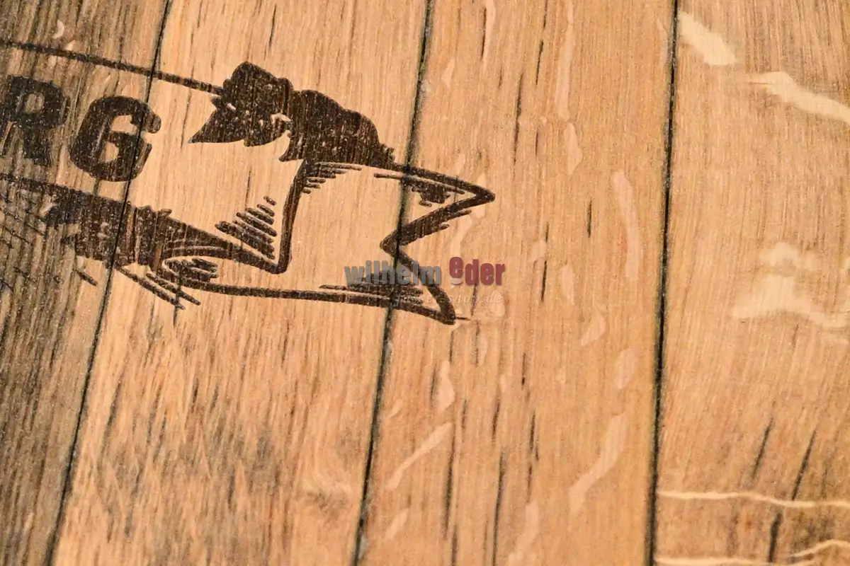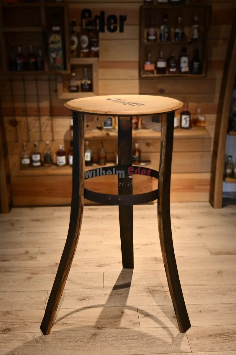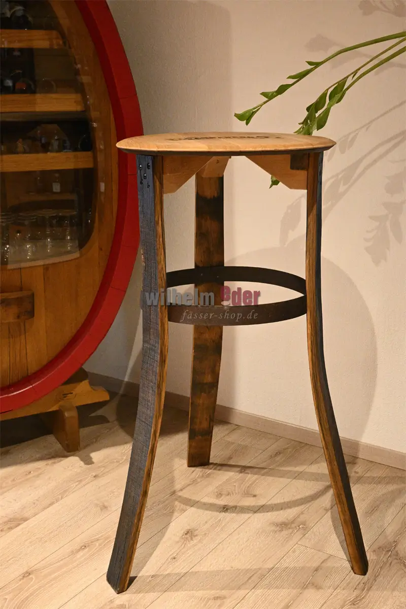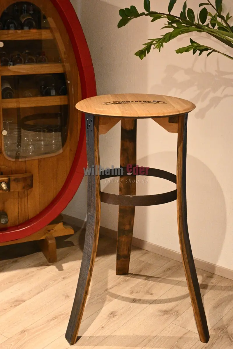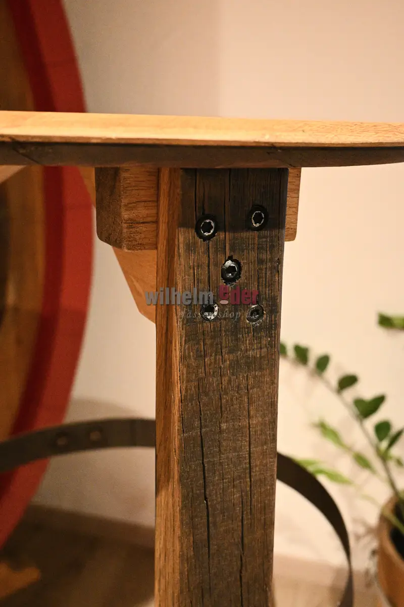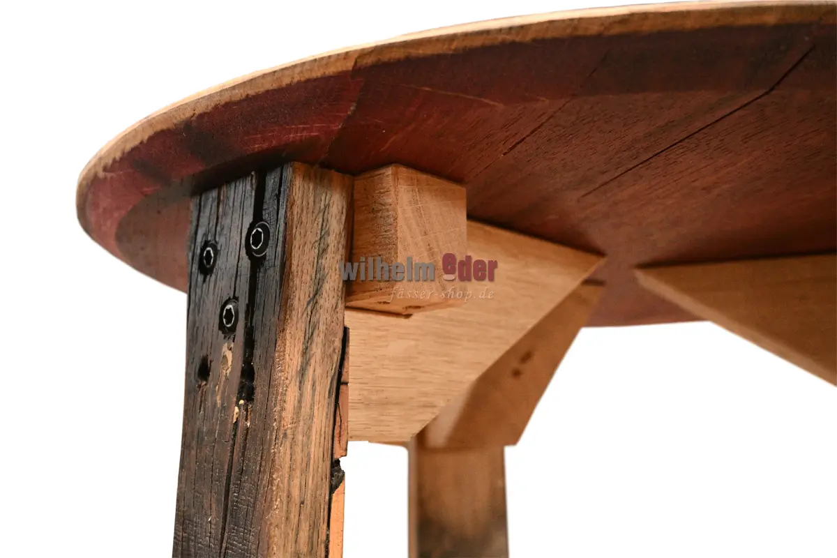 Le plateau rond est fabriqué à partir de douelles de chêne soigneusement nettoyées, séchées et assemblées. Sur demande, il peut être personnalisé avec un marquage au laser (logo de l’entreprise, blason, etc.). Le tout est soutenu par trois douelles de chêne courbées, issues de grands fûts ayant contenu du vin.
