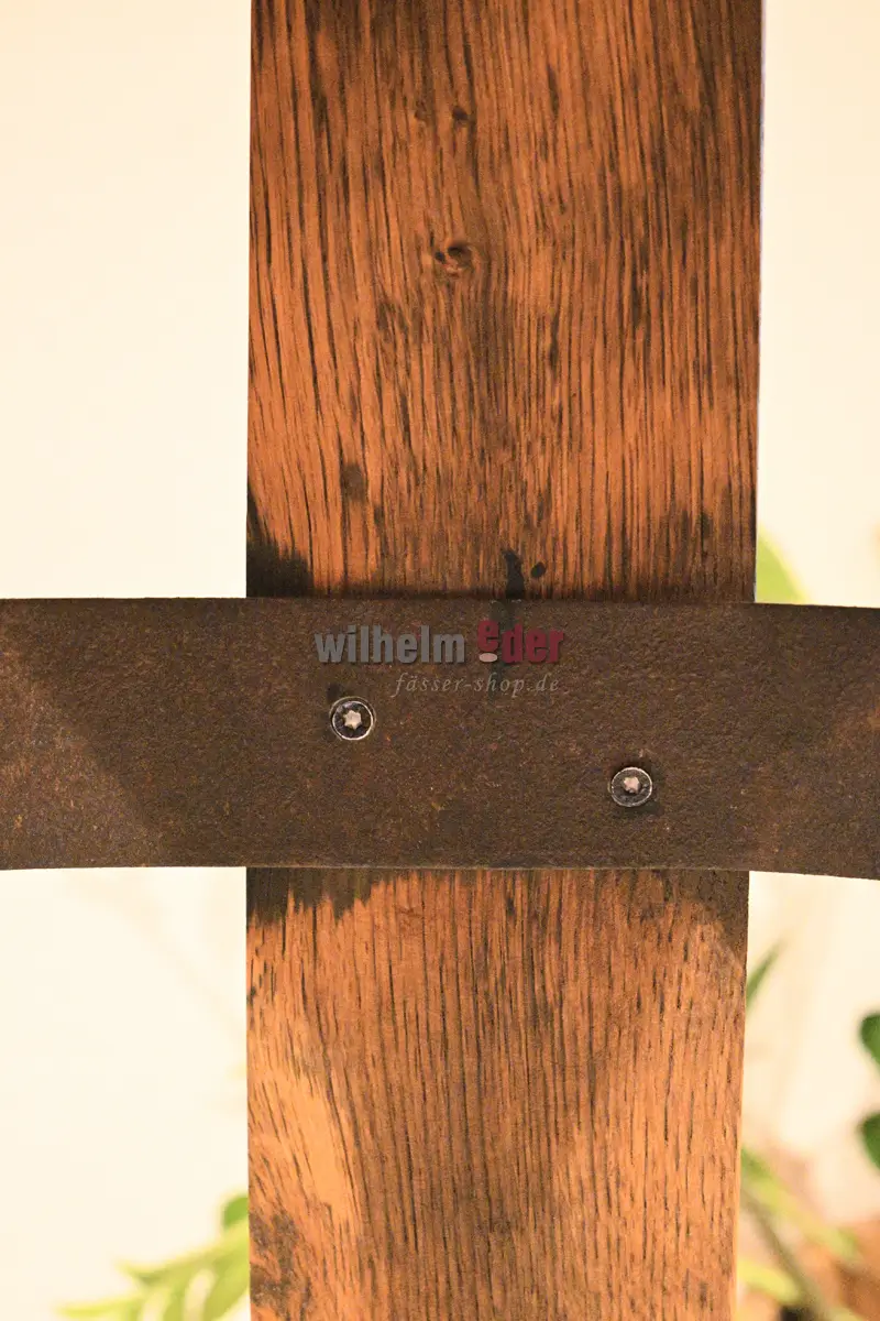 Un cerclage de tonneau usagé maintient solidement les douelles en leur centre et souligne l’aspect typique de cette pièce unique.