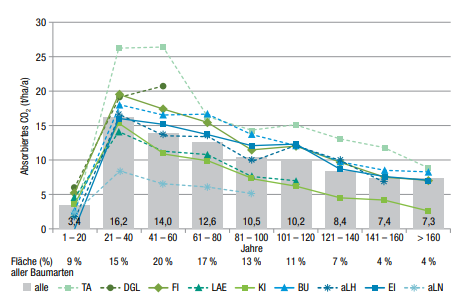 Den Zahlen des Bundesministerium für Ernährung und Landwirtschaft zufolge sind aktuell 2,6 Milliarden Tonnen Kohlenstoff in Form von lebender Biomasse, Totholz und Boden in deutschen Wäldern gebunden. Die jährliche Kohlenstoffspeicherung beläuft sich auf gegenwärtig 57 Millionen Tonnen Kohlenstoffdioxid.