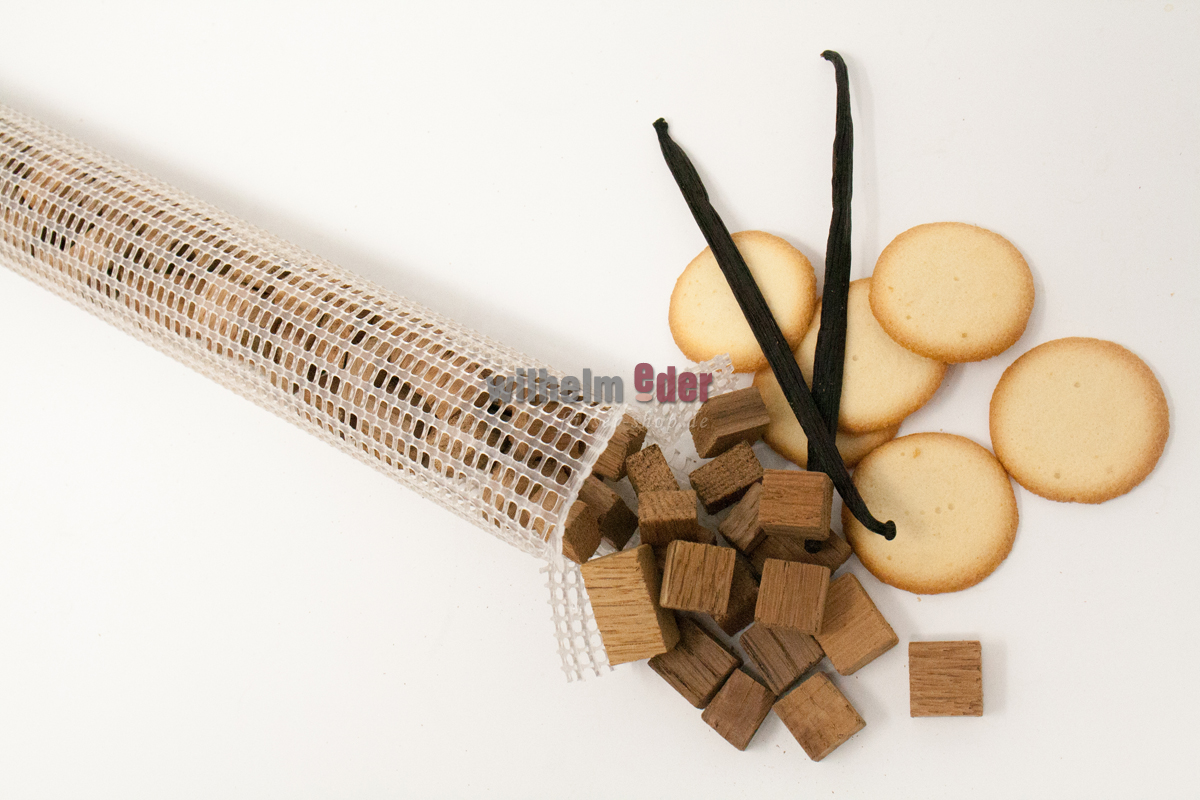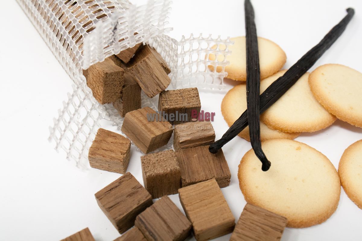 Rempli de High Moka cubes d'environ 200 g, le vin reçoit une note de cerise noire! Chêne français, rempli de cubes de High Vanille 200 g, équilibre l´arôme de fruit et bois particulièrement aux vins de Bourgogne.