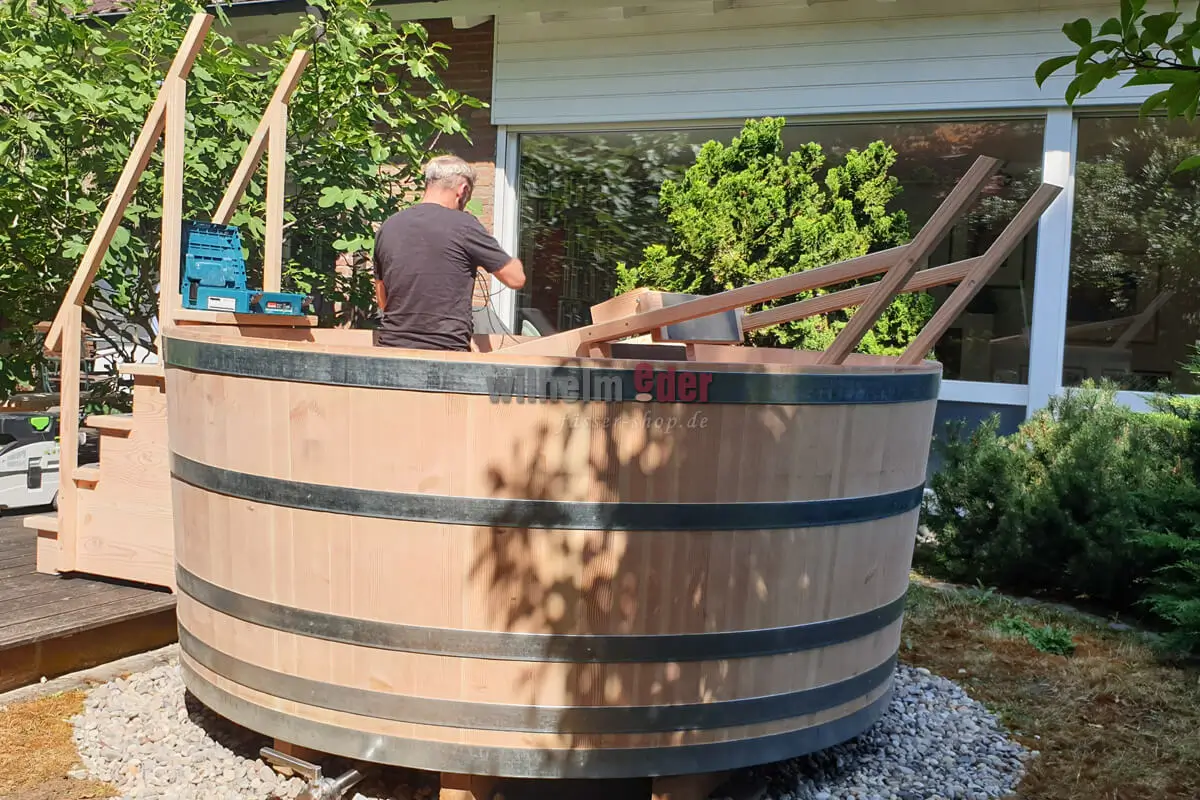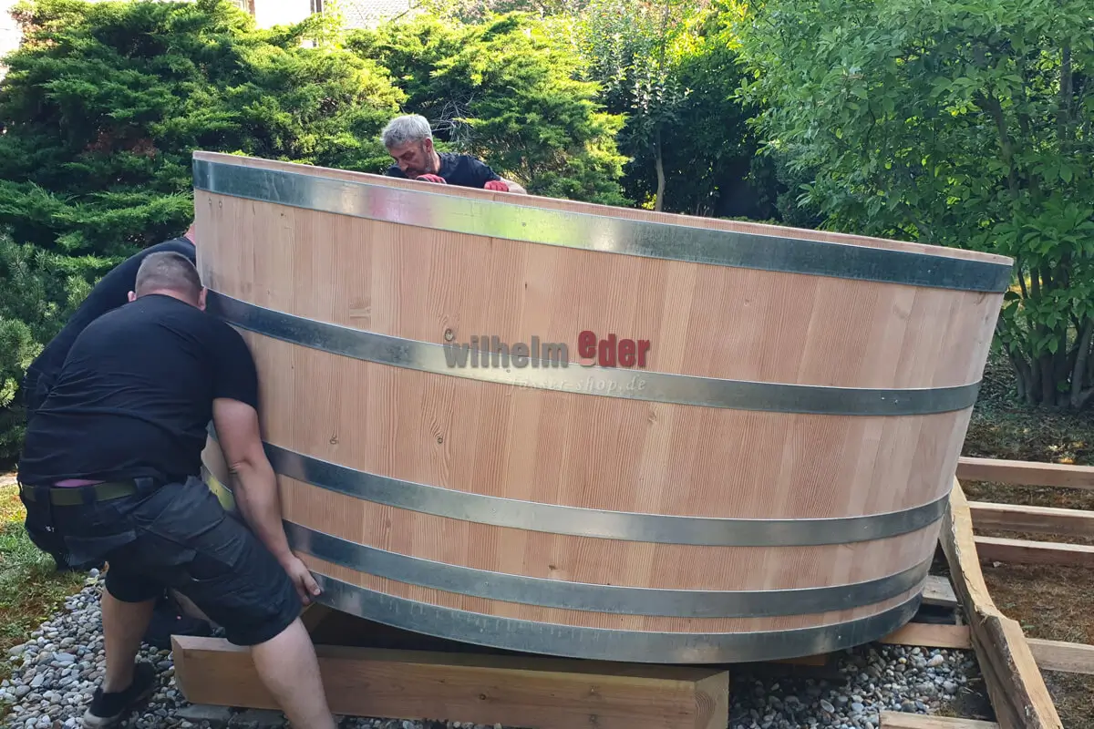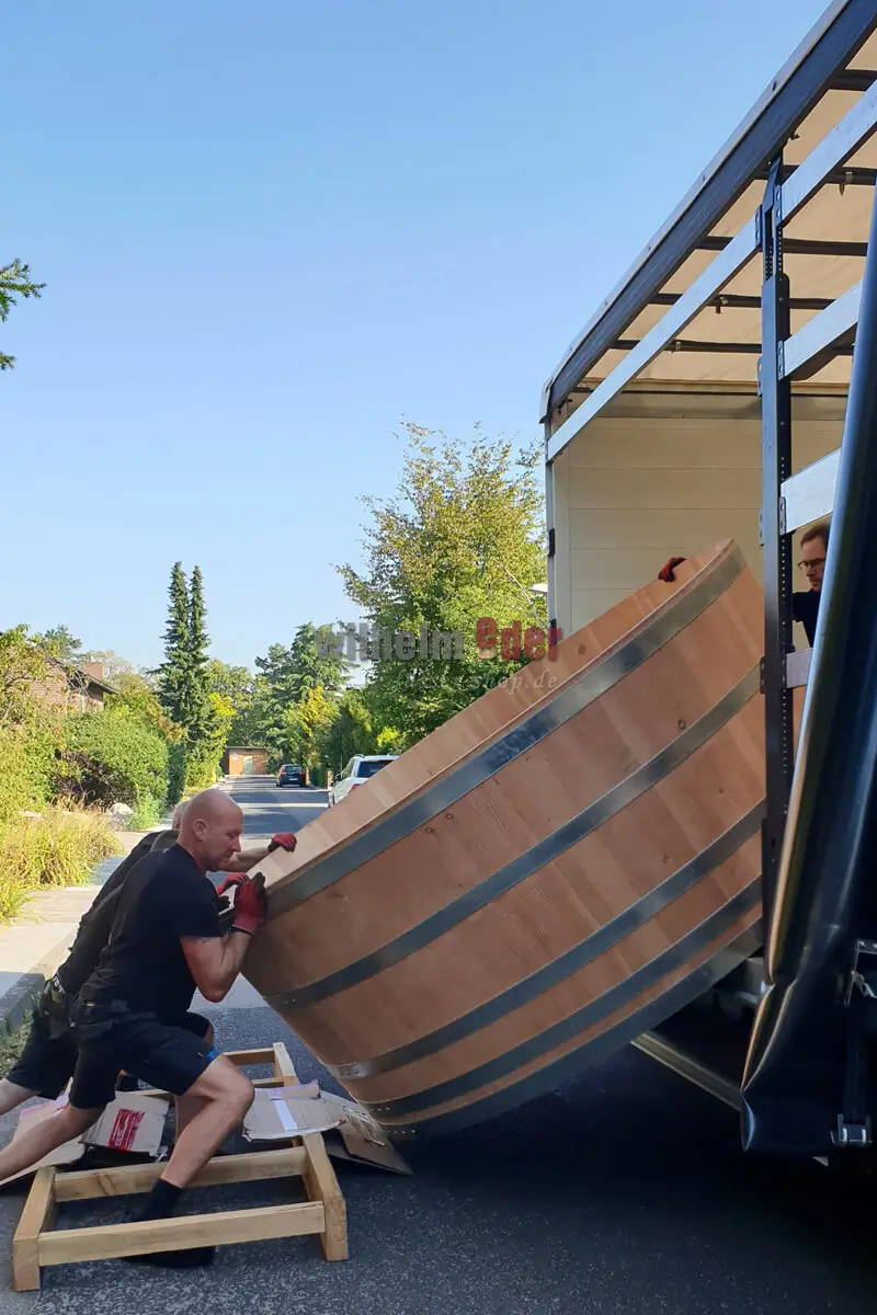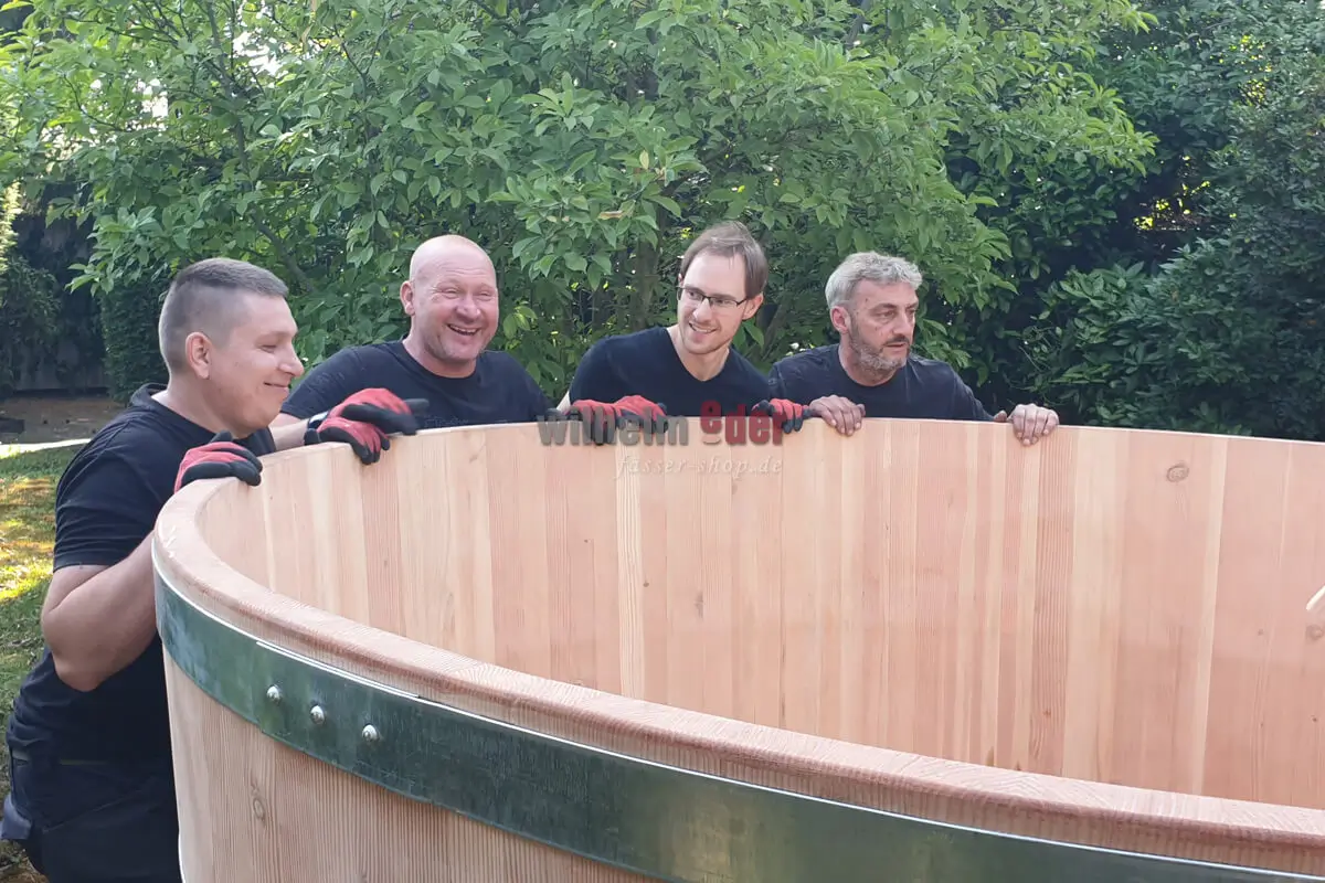 Planning the delivery is a chapter of its own! It It is organised alongside the the construction of the new barrel pool. The local conditions are important for the construction and delivery of the tub – if possible, we check the conditions in advance. The question is often whether it is possible to get into the garden with a normal lift truck or whether we have to use larger equipment due to the size and weight of the tub. Access to the garden also plays a role. Is the path wide enough, overgrown or not, would the customer be willing to “sacrifice” a few branches or do other paths have to be used? Sometimes a small transport scaffold is also built for the wooden pool. One of the small tricks so that the tub arrives intact.