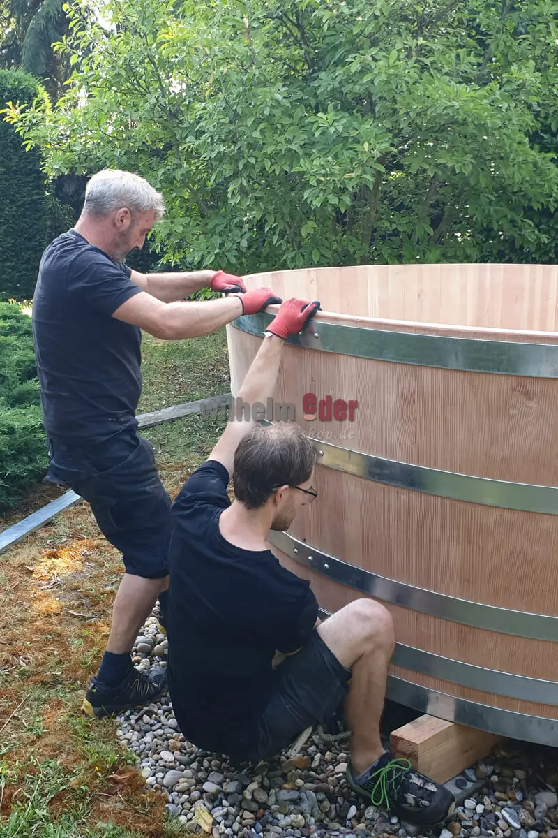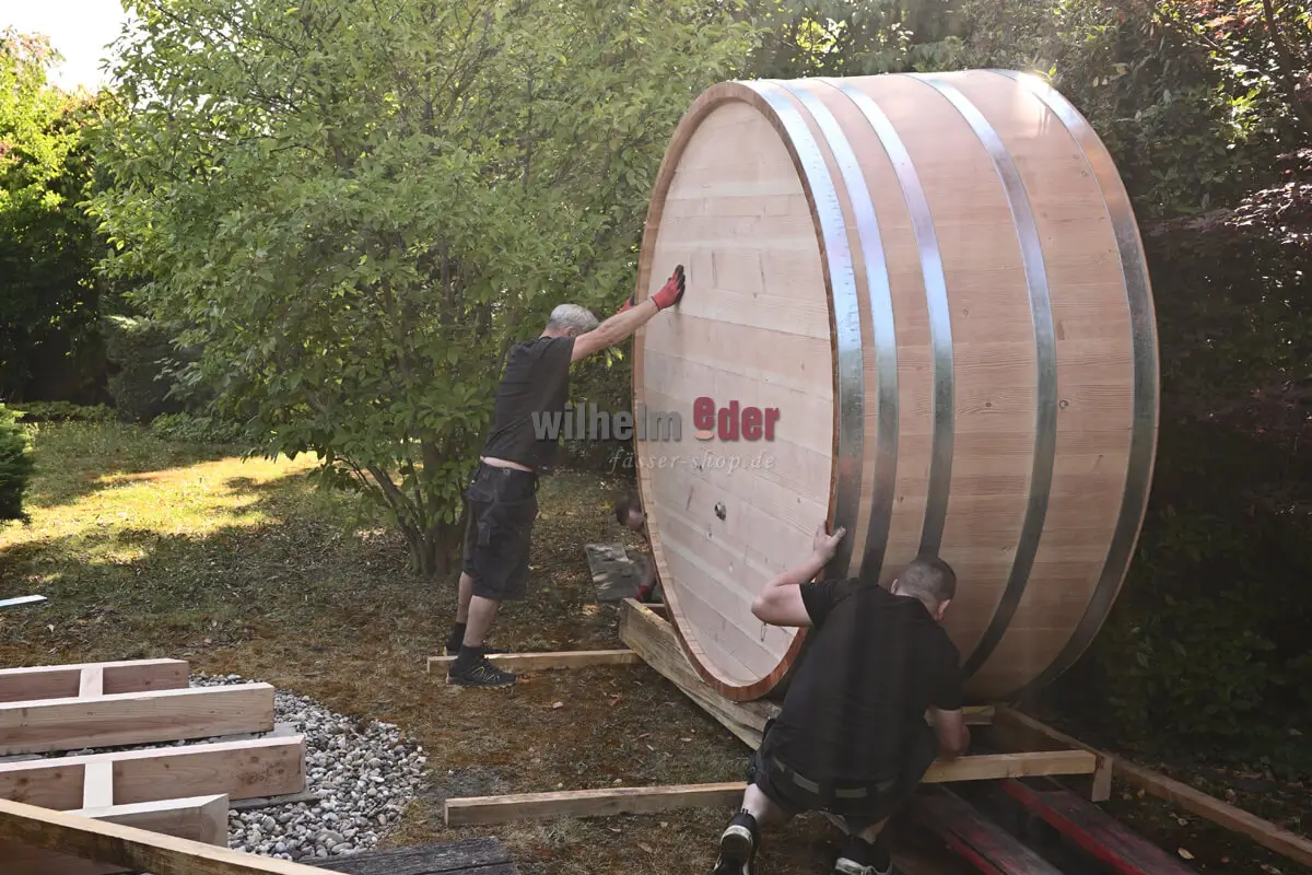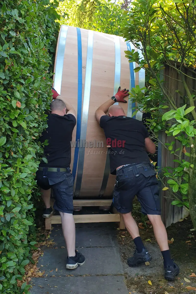 Difficulty level 100/100 – The task: The transport of the bath barrel from the truck to the site in the garden where the tub should be placed. If the unloading was not easy, now comes the supreme discipline! If I am honest, I had some doubts whether the wooden tub would fit through the path in the garden as my colleagues had imagined and planned. But a good craftsman or -woman always knows how to cope and experience shows. With a lot of communication and “Next”, “Stop”, “Right”, “Push” and much more, my colleagues maneuvered the bathtub into place. After consultation with the customer, however, one or another branch still had to be removed or a stone had to be temporarily moved to the side.
