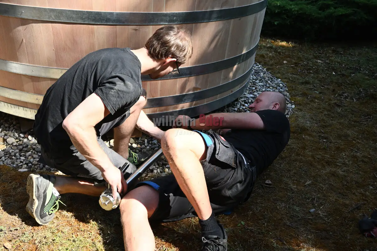 After the watering, the hot tub goes onto the boss… sorry, for a final inspection. Markus, Nico or Jonas Eder take a last critical look at the new centerpiece for the customer’s garden. If the tub passes the inspection, the delivery is planned.